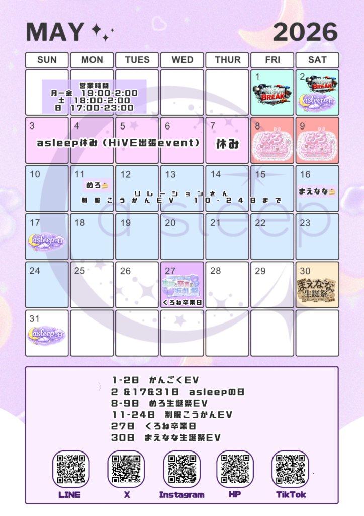 【浜松コンカフェ/アスリープ】2026年5月カレンダー