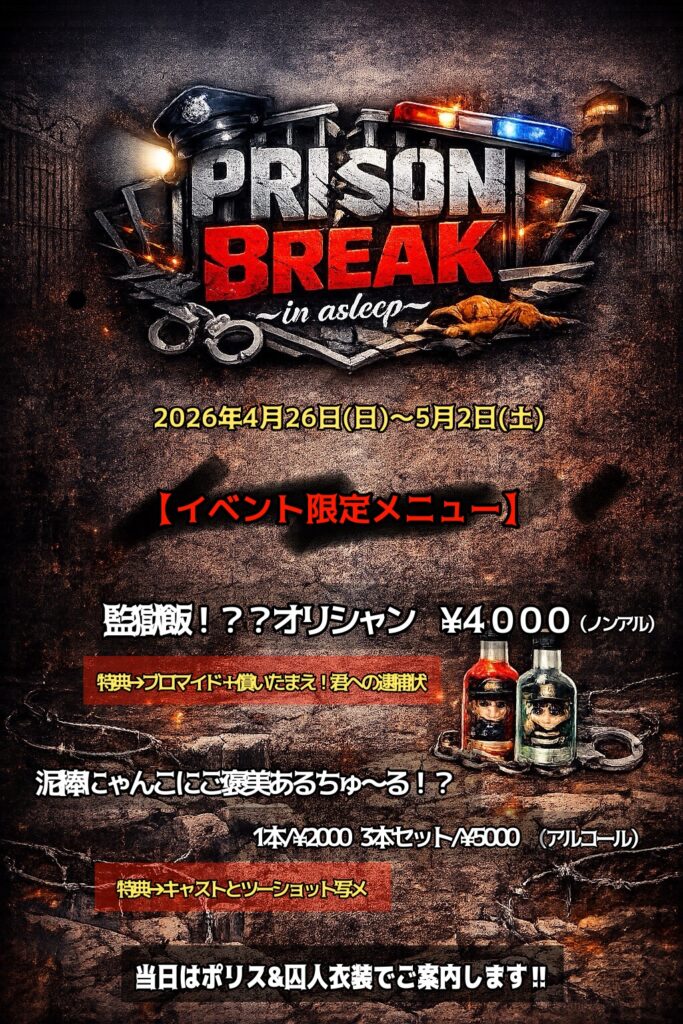 案内人がポリス&囚人衣装にてご案内します!コンセプトならではの体験型メニューもご用意しておりますので是非お楽しみに♪