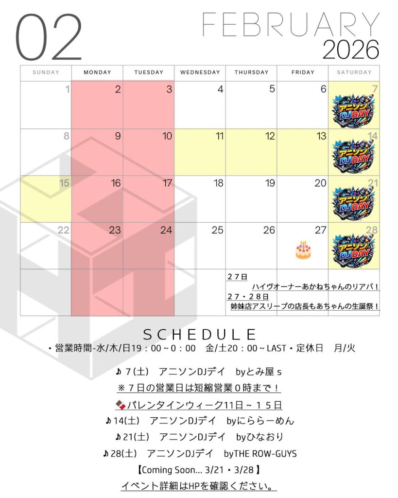 【浜松サブカルチャーバーハイヴ】2026年2月営業カレンダー