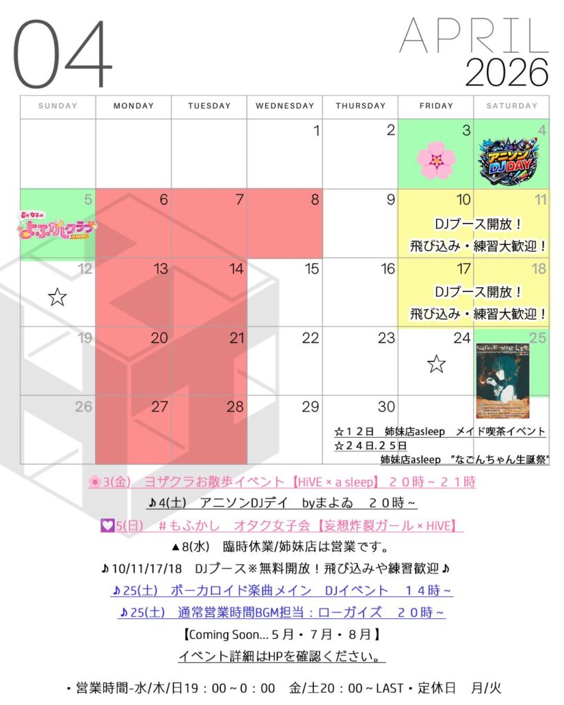 【浜松サブカルチャーバーハイヴ】2026年4月営業カレンダー