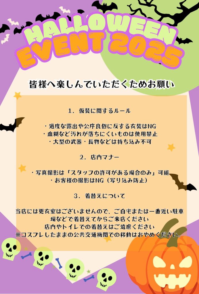 今回はお客様の仮装や黒コーデをしていて頂くと特典がございます🎃