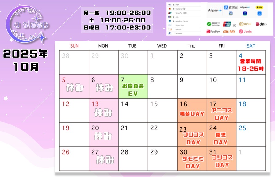 【浜松コンカフェ/アスリープ】2025年10月カレンダー